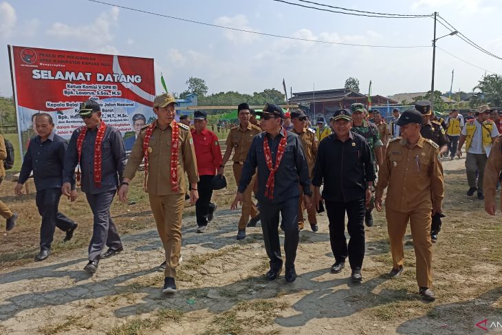 Ketua Komisi V DPR RI Lasarus bersama Kepala Balai Penanganan Jalan Nasional Kalimantan Barat (Kalbar) serta Bupati Kapuas Hulu melakukan peluncuran pekerjaan pembangunan peningkatan ruas jalan Nanga Manday-Nanga Embaloh Kecamatan Embaloh Hilir, wilayah Kabupaten Kapuas Hulu, Kalimantan Barat, Senin (4/9/2023). ANTARA/Teofilusianto Timotius