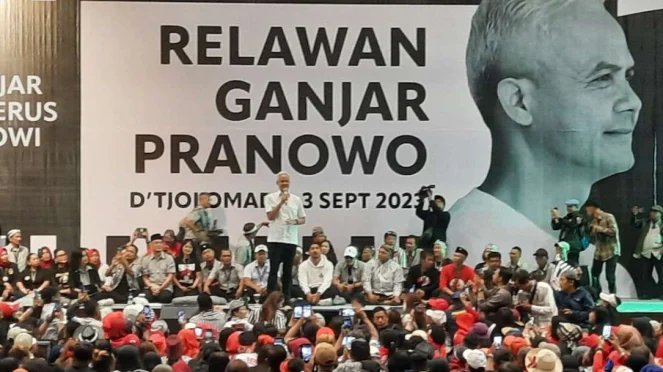 Bakal calon presiden Ganjar Pranowo berbicara di hadapan ribuan relawan yang memadati De Tjolomadoe, Karanganyar, Jawa Tengah, Minggu, 3 September 2023.