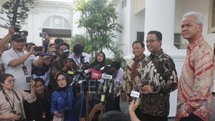 Tiga bakal calon presiden yang akan bertarung pada Pemilu 2024: Prabowo Subianto (kiri), Anies Baswedan (tengah), dan Ganjar Pranowo memberikan keterangan pers usai makan siang bersama Presiden Jokowi di Komplek Istana Kepresidenan, Jakarta, Senin 30 Oktober 2023. TEMPO/Subekti.