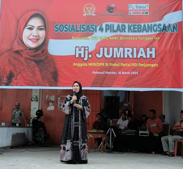 jaringanmilenialnusantara.id – Anggota Komisi 8 DPR RI Fraksi PDI Perjuangan Dapil Sulawesi Barat Hj. Jumriah menggelar Sosialisasi 4 pilar kebangsaan (Pancasila, UUD 1945, NKRI, Bhineka Tunggal Ika) yang berlangsung di Rumah Asprasi Hj.Jumriah di Kec. Polewali, Kab. Polewali Mandar, Sabtu, (16/03/2024).