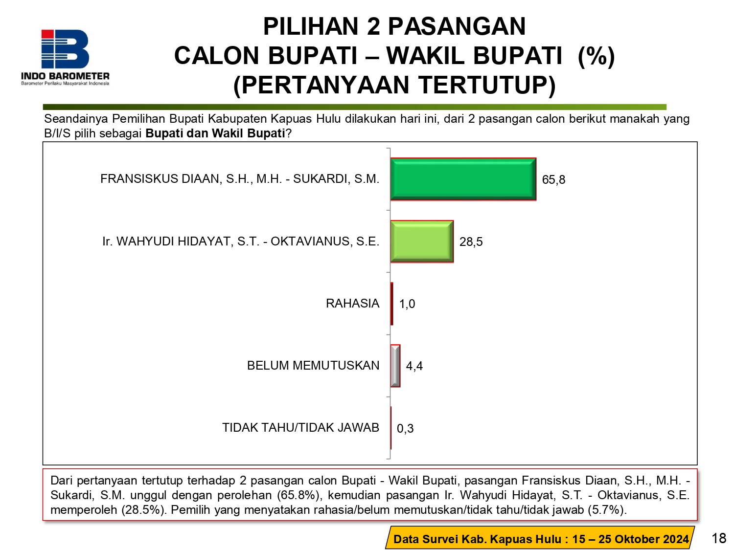 “Dalam simulasi dua nama, karena pilkada kapuas hulu ada dua calon nama itu Temuan kami bahwa calon bupati fransiskus dian elektabilitas nya 65,8% sedangkan Wahyu Hidayat elektabilitasnya 28,5% kemudian mereka yang belum menjawab, belum memutuskan dan tidak tau atau rahasia ini jumlahnya sekitar 6 persen, jadi sebagian besar pemilih di Kapuas Hulu sudah punya pilihan,”ucapnya.